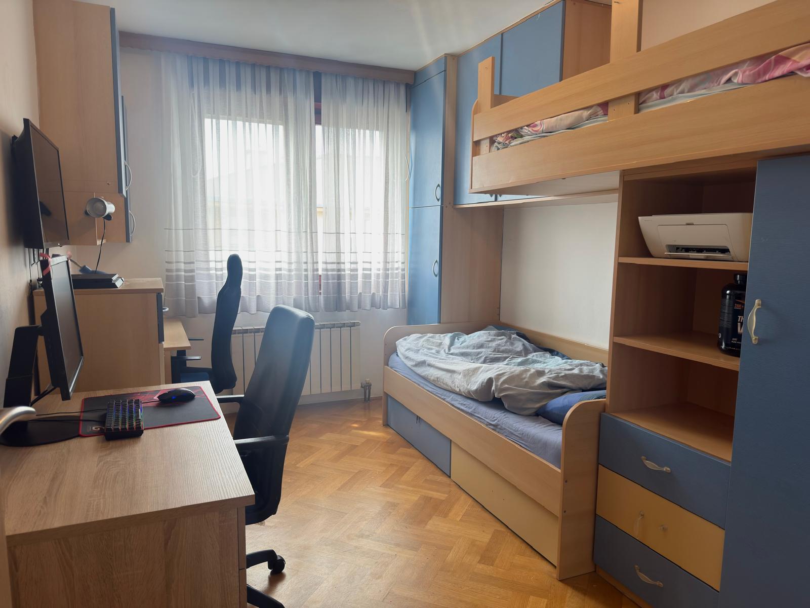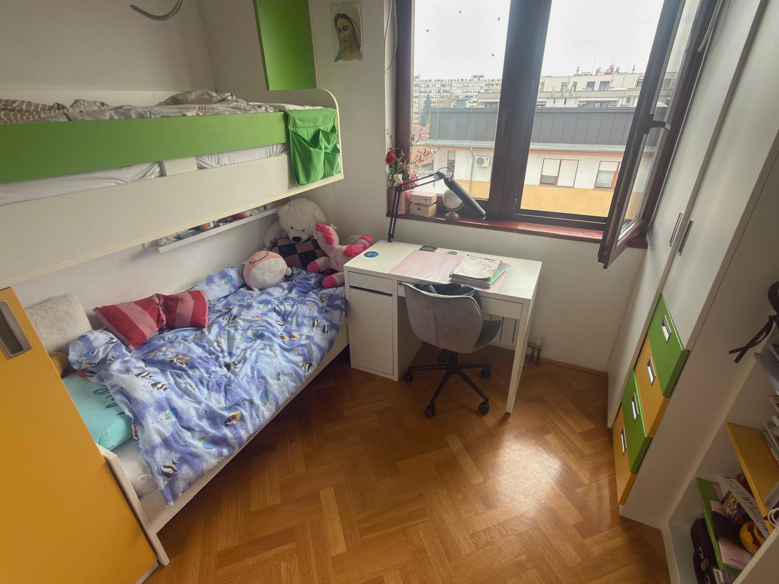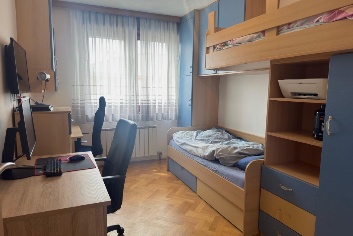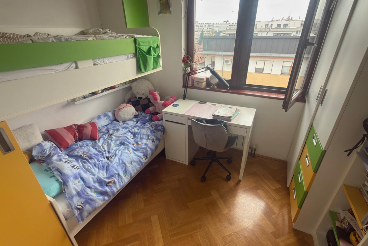 Zagreb, Špansko, prodaje se svijetao i funkcionalan 4-sobni stan NKP 77 m², smješten na 5. katu stambene zgrade s liftom izgrađene 2001. godine, s direktnim pristupom liftu iz garaže. Stan ima trostranu orijentaciju istok–jug–zapad, što mu osigurava obilje prirodnog svjetla tijekom cijelog dana, a sastoji se od dnevnog boravka s kuhinjom, tri spavaće sobe, kupaonice, odvojenog WC-a, ostave te lođe i balkona koji je zatvoren PVC stolarijom. Manja dječja soba pregrađena je knaufom te se pregrada može jednostavno ukloniti prema željama budućeg vlasnika. Uz stan dolazi i spremište površine 4,8 m² smješteno na istoj etaži, dok je oko zgrade dostupan besplatan javni parking, uz mogućnost kupnje duple garaže. Lokacija je izuzetno praktična za svakodnevni život, u neposrednoj blizini nalaze se škola, vrtić, crkva, trgovine, tržnica i dom zdravlja, a kvart je odlično povezan javnim prijevozom s autobusnim linijama i željezničkom postajom u blizini.